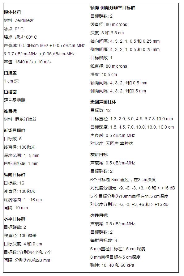 CIRS公司生產(chǎn)的040GSE型多用途/多組織超聲模體包含了9種性能測(cè)試,例如灰階目標(biāo)、無(wú)回聲目標(biāo)和彈性目標(biāo)。該模體超越了ACR組織對(duì)于超聲檢測(cè)的要求,令其成為當(dāng)今市面上既可滿足當(dāng)今也可滿足未來(lái)超聲質(zhì)量檢測(cè)要求的模體。 背景凝膠采用獨(dú)特的雙重衰減設(shè)計(jì),令得該模體可以評(píng)估的探頭頻率覆蓋了2MHz-15MHz范圍,模體采用了可拆卸的存水槽設(shè)計(jì),可以評(píng)估各種各樣大小的超聲探頭,包括線陣探頭、凸面探頭和腔內(nèi)探頭等。