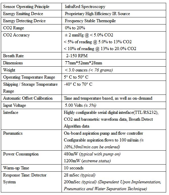The OEM ETCO2 module (C200) is a complete data collection and analysis system for monitoring respiratory carbon dioxide concentration. The C200 module includes a miniature CO2 sensor, barometric pressure transducer, sampling flow control and a miniature low-power vacuum pump. A microprocessor collects the sensor data and calculates various real-time parameters: instantaneous CO2 concentration, respiration rate, end-tidal CO2, inspired CO2, inspiration and expiration times.